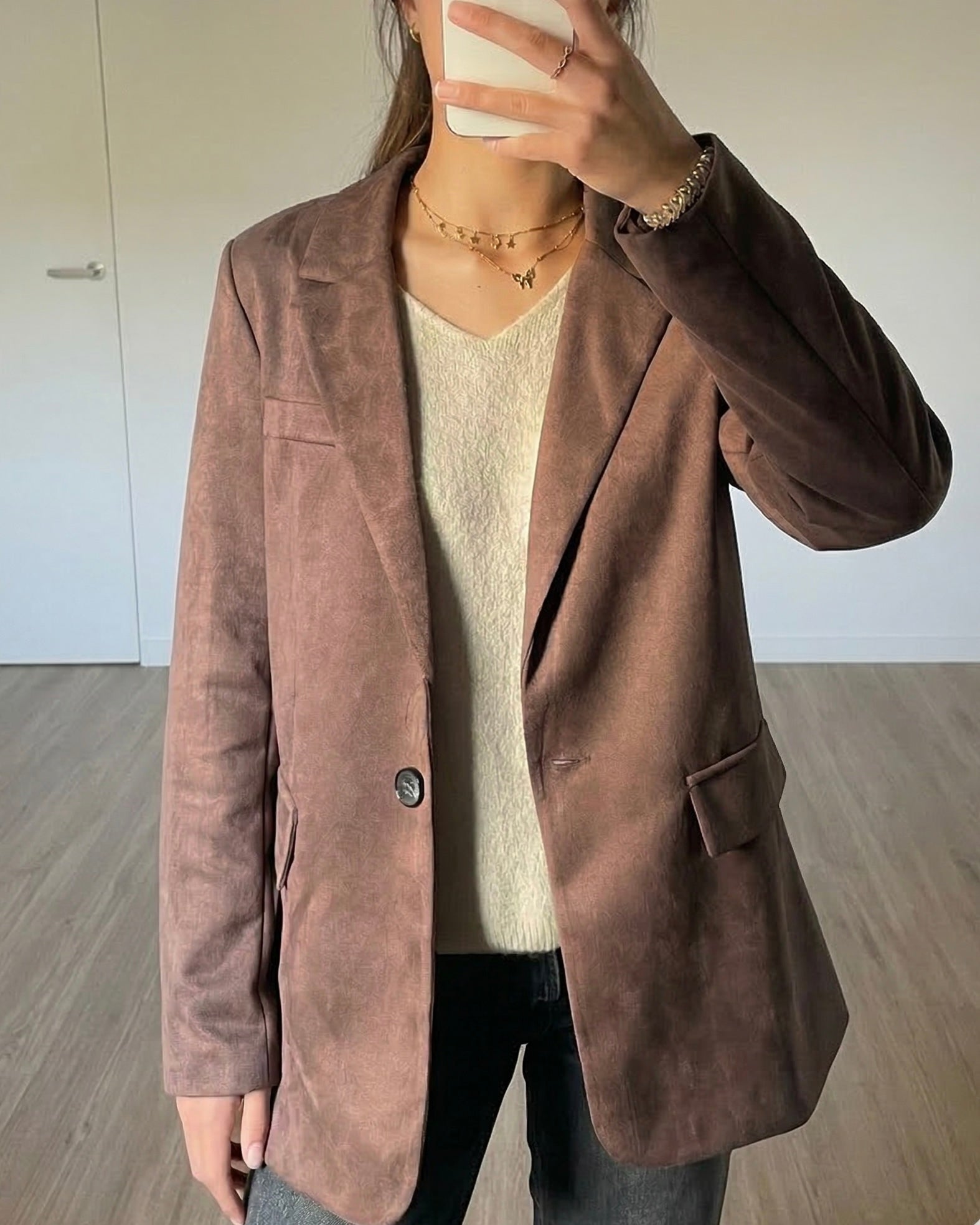 ▫ Type : Veste blazer en suédine avec doublure et bouton sur le devant.